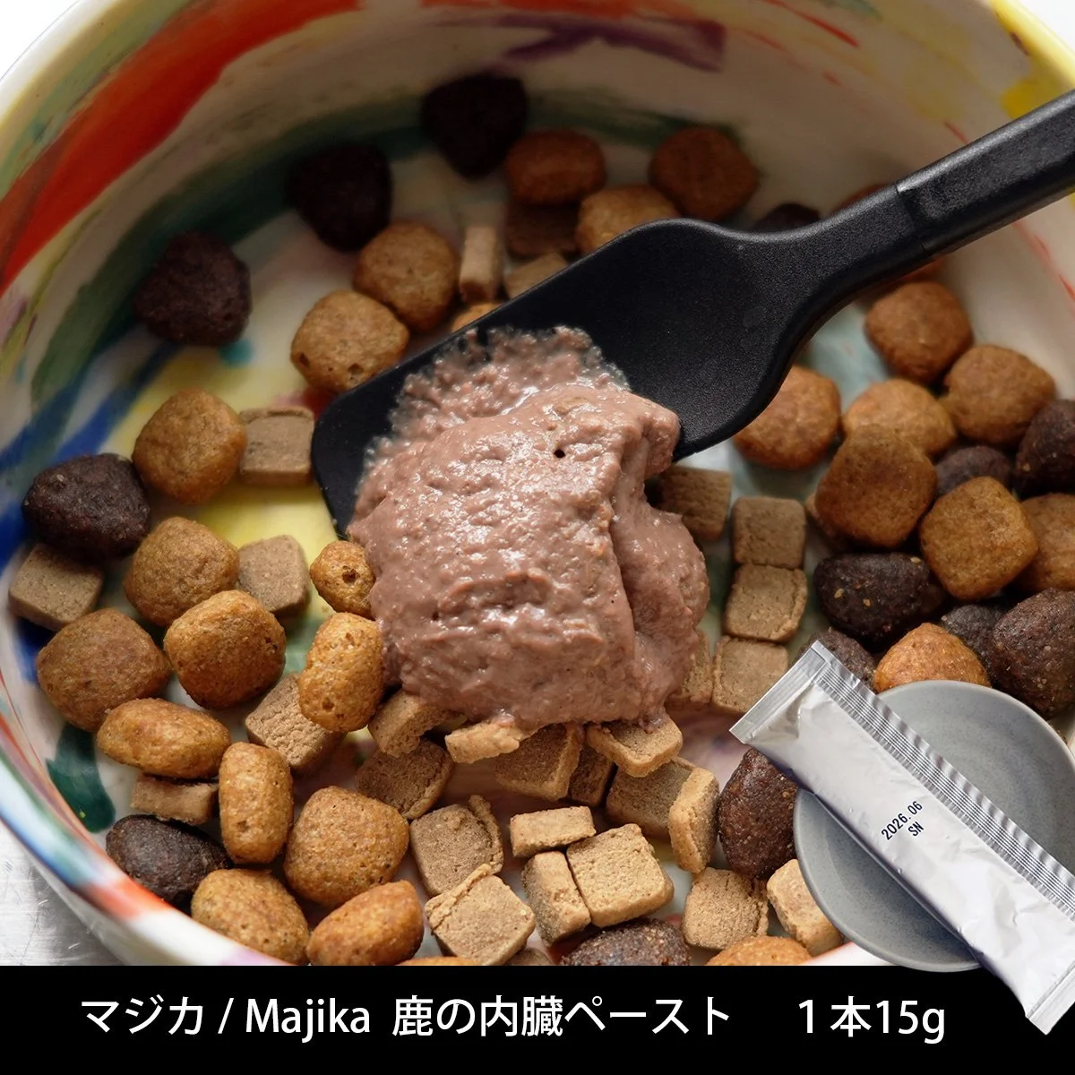 鹿の内臓(心臓、肺、肝臓)をペーストにしました。入っているのは内臓、米粉、ビタミンEだけ。トッピングなど全年齢におすすめ。